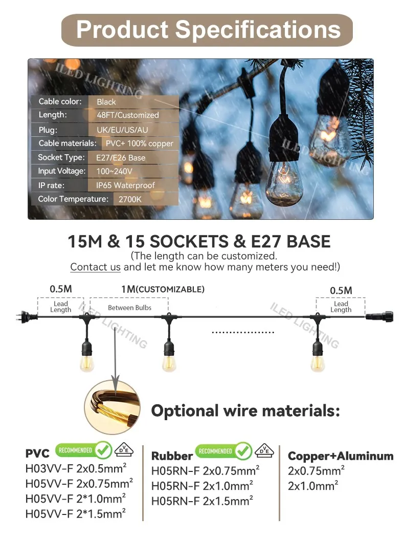 | Length | 14.4m 15pcs/ 5M 10pcs/ 10M 10pcs hanging socket |